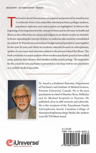 The book is about Neuroscience as acquired and practiced by myself across 3 continents: from Cairo, issues like colonial psychiatry, pellagra madness, population explosion and contraception are highlighted. In Moscow the beginning of my long interest in the concept of stress and its relevance to health and illness as also reflections on science and relegion in an athiest society are detailled . In Rome expanding the concept of stress to cardiovascular reactivity consolidated my interest . In Toronto my neuroscience background and psychiatry came together for the next 50 years and where my academic interests focused on shizophrenia, quality of care issues and outcomes related to the person behind the illness . The book concludes in a major analysis of how modern psychiatric practices has failed many : patients, their doctors, their families and the society at large. The imperative for the search for new psychiatry is presented as my deep wish to save psychiatry as a credible medical speciality ..