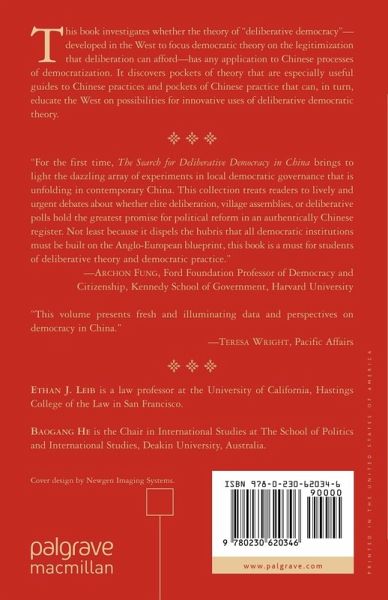This book investigates whether the theory of deliberative democracy - developed in the West to focus democratic theory on the legitimation that deliberation can afford - has any application to Chinese processes of democratization. It discovers pockets of theory especially useful to guide Chinese practices and pockets of Chinese practice that can, in turn, educate the West on possibilities for innovative uses of deliberative democratic theory.