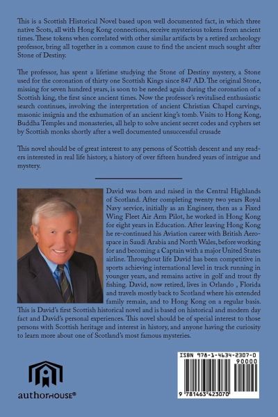 This Scottish Historical Novel is based on well known historical events and the author's personal experiences. The novel's main characters include three unrelated native born Scots. Tracy, a lady Royal Navy fighter pilot operating from her ship, H.M.S. Ark Royal, above the South China seas off Hong Kong; Alan, a Royal Bank of Scotland manager employed in the bank's Hong Kong office also acting as a volunteer Auxiliary Marine Police Inspector operating in Hong Kong waters: and Grant, an almost destitute professional golfer playing his last sponsored professional golf tournament in China. These three characters, albeit during unusual circumstances, each receive separate "signs"in the form of mysteriously engraved coins or tokens. These "tokens", when compared with similar "tokens" found after worldwide searches by Archeology Professor Angus Ogilvy, bring all five characters together in a common cause. This cause, namely finding the much sought after ancient Scottish artifact; the "Stone of Destiny" also known as "Jacob's Pillow", creates the intriguing theme of this novel. Since the year 847 AD, thirty one Scottish kings were crowned sitting upon the ancient "Stone of Destiny" it having originated in the Holy Land and brought to Scotland during the fourth century. In the year 1296 AD, King Edward 1st of England, more commonly known as "Longshanks" of the film Braveheart fame , plundered Scotland, took the "Stone of Destiny" to London and had it placed under the English monarchy coronation throne in Westminster Abbey. There it remained almost continuously for over seven hundred years. In 1951, four Scottish University students successfully heisted that Stone and returned with it to Scotland. However, after being hidden for four months it was found in Arbroath Abbey, and shortly after returned to Westminster Abbey and replaced under the English coronation chair. Recently Scotland has regained Independence from England and the first crowning of a Scottish monarch is soon due, that monarch being directly descended from King Robert the Bruce, the real "Braveheart" who reigned from 1306 - 1329. The"Stone" , recently returned to Scotland shortly after the tragic death of Princess Diana, will be used again during the forthcoming coronation. However the returned "Stone" presently on display in Edinburgh Castle alongside the ancient Scottish Crown Jewels, has been proved a fake through geological testing. Now with much added incentive, the ages old hunt is on again to find the genuine "Stone" Retired Archeology Professor Angus Ogilvy, has spent a lifetime studying the mystery of the "Stone of Destiny", regrettably without much success. Now, with the help of Tracy, Alan and Grant, his enthusiasm and interest is greatly renewed. The Professor's life long search continues, involving the interpretation of ancient Christian Chapel carvings, Scottish rite Masonic insignia, the exhumation of an ancient king's tomb, and visits to Hong Kong, a Buddha Temple and nearby monasteries. These investigations all help to unravel the secrets of ancient codes and cyphers, which if solved will hopefully reveal the whereabouts of the ancient and original "Stone of Destiny". This original "Stone" if found and used in the upcoming coronation, would for Scottish people greatly enhance the validity and accuracy of their revered ages-old ceremony. With the help of a World War Two code breaking expert, specialised programming of a modern day cypher computer and meticulous inspection of ancient maps and manuscripts, the hopes of Angus and his helpers often rise and fall - but hope always springs eternal.