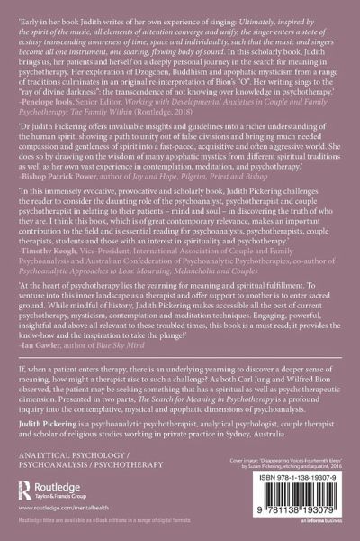 2020 American Board & Academy of Psychoanalysis (ABAPsa) book award winner! If, when a patient enters therapy, there is an underlying yearning to discover a deeper sense of meaning or purpose, how might a therapist rise to such a challenge? As both Carl Jung and Wilfred Bion observed, the patient may be seeking something that has a spiritual as well as psychotherapeutic dimension. Presented in two parts, The Search for Meaning in Psychotherapy is a profound inquiry into the contemplative, mystical and apophatic dimensions of psychoanalysis. What are some of the qualities that may inspire processes of growth, healing and transformation in a patient? Part One, The Listening Cure: Psychotherapy as Spiritual Practice, considers the confluence between psychotherapy, spirituality, mysticism, meditation and contemplation. The book explores qualities such as presence, awareness, attention, mindfulness, calm abiding, reverie, patience, compassion, insight and wisdom, as well as showing how they may be enhanced by meditative and spiritual practice. Part Two, A Ray of Divine Darkness: Psychotherapy and the Apophatic Way, explores the relevance of apophatic mysticism to psychoanalysis, particularly showing its inspiration through the work of Wilfred Bion. Paradoxically using language to unsay itself, the apophatic points towards absolute reality as ineffable and unnameable. So too, Bion observed, psychoanalysis requires the ability to dwell in mystery awaiting intimations of ultimate truth, O, which cannot be known, only realised. Pickering reflects on the works of key apophatic mystics including Dionysius, Meister Eckhart and St John of the Cross; Buddhist teachings on meditation; ¿¿nyat¿ and Dzogchen; and Lévinas' ethics of alterity. The Search for Meaning in Psychotherapy will be of great interest to both trainees and accomplished practitioners in psychoanalysis, analytical psychology, psychotherapy and counselling, as well as scholars of religious studies, those in religious orders, spiritual directors, priests and meditation teachers.