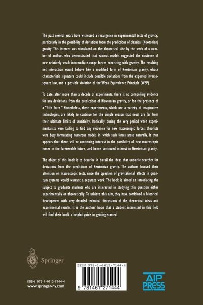 Newton's inverse-square law of gravitation has been one of the cornerstones of physics ever since it was proposed 300 years ago. One of its most well known features is the prediction that all objects fall in a gravitational field with the same acceleration. This observation, in the form of the Equivalence Principle, is a fundamental assumption of Einstein's General Relativity Theory. This book traces the history of attempts to test the predictions of Newtonian Gravity, and describes in detail recent experimental efforts to verify both the inverse-square law and the Equivalence Principle. Interest in these questions have increased in recent years, as it has become recognized that deviations from Newtonian gravity could be a signal for a new fundamental force in nature. This is the first book devoted entirely to this subject, and will be useful to both graduate students and researchers interested in this field. This book describes in detail the ideas that underlie searches for deviations from the predictions of Newtonian gravity, focusing on macroscopic tests, since the question of gravitational effects in quantum systems would warrant a separate work. A historical development is combined with detailed technical discussions of the theoretical ideas and experimental results. A comprehensive bibliography with approximately 450 entries is provided.