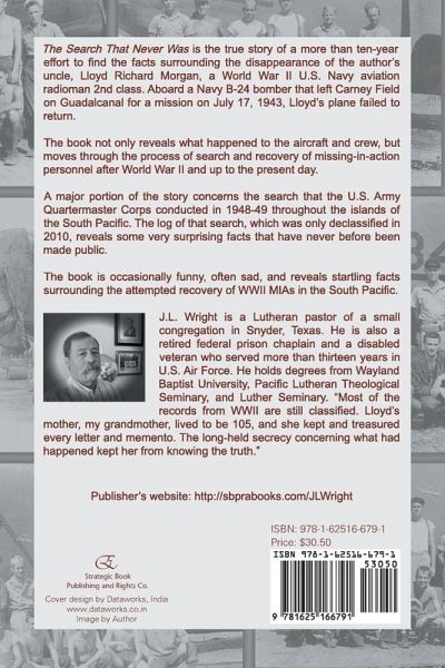 The Search That Never Was is the true story of a more than ten-year effort to find the facts surrounding the disappearance of the author's uncle, Lloyd Richard Morgan, a World War II U.S. Navy aviation radioman 2nd class. Aboard a Navy B-24 bomber that left Carney Field on Guadalcanal for a mission on July 17, 1943, Lloyd's plane failed to return. The book not only reveals what happened to the aircraft and crew, but moves through the process of search and recovery of missing-in-action personnel after World War II and up to the present day. A major portion of the story concerns the search that the U.S. Army Quartermaster Corps conducted in 1948-49 throughout the islands of the South Pacific. The log of that search, which was only declassified in 2010, reveals some very surprising facts that have never before been made public. The book is occasionally funny, often sad, and reveals startling facts surrounding the attempted recovery of WWII MIAs in the South Pacific. J.L. Wright is a Lutheran pastor of a small congregation in Snyder, Texas. He is also a retired federal prison chaplain and a disabled veteran who served more than thirteen years in U.S. Air Force. He holds degrees from Wayland Baptist University, Pacific Lutheran Theological Seminary, and Luther Seminary. "Most of the records from WWII are still classified. Lloyd's mother, my grandmother, lived to be 105, and she kept and treasured every letter and memento. The long-held secrecy concerning what had happened kept her from knowing the truth."