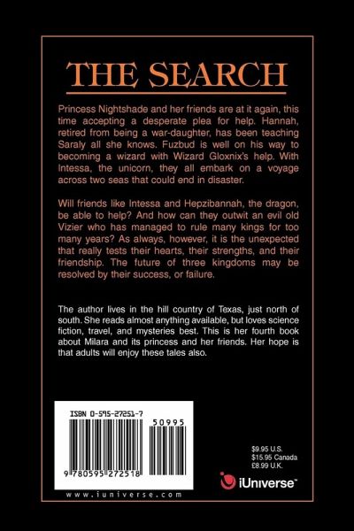 Princess Nightshade and her friends are at it again, this time accepting a desperate plea for help. Hannah, retired from being a war-daughter, has been teaching Saraly all she knows. Fuzbud is well on his way to becoming a wizard with Wizard Gloxnix's help. With Intessa, the unicorn, they all embark on a voyage across two seas that could end in disaster.