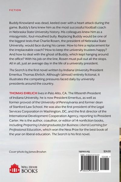 "A former president of Indiana University writes a secret novel...about being a university president. Originally written under a pseudonym, The Search tells the story of Charlie Rosen, president of the fictional Nebraska State University. His antagonist is "Buddy" Knowland, legendary football coach at Nebraska State and also the athletic director. Knowland is a foul-mouthed bully and misogynist, but also the most successful coach in Nebraska State history. Knowland dies suddenly of a heart attack during a football game, but his ghost haunts Rosen throughout the novel. Rosen's six-month search for a new football coach/athletic director who will satisfy the University trustees becomes an epic, truly revealing tale of the challenges and rewards, crises and duties, facing university presidents."--