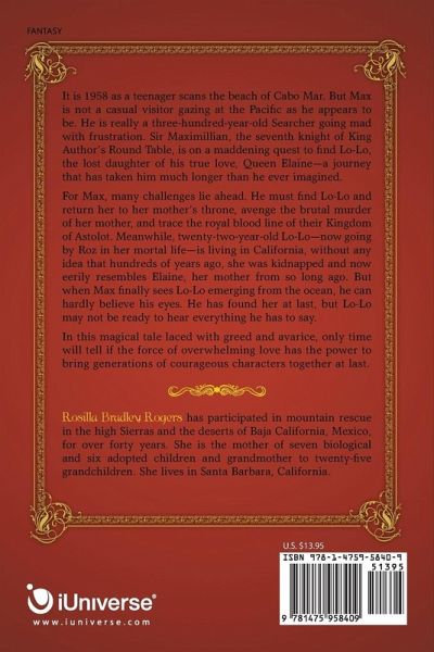 It is 1958 as a teenager scans the beach of Cabo Mar. But Max is not a casual visitor gazing at the Pacific as he appears to be. He is really a three-hundred-year-old Searcher going mad with frustration. Sir Maximillian, the seventh knight of King Author's Round Table, is on a maddening quest to find Lo-Lo, the lost daughter of his true love, Queen Elaine-a journey that has taken him much longer than he ever imagined. For Max, many challenges lie ahead. He must find Lo-Lo and return her to her mother's throne, avenge the brutal murder of her mother, and trace the royal blood line of their Kingdom of Astolot. Meanwhile, twenty-two-year-old Lo-Lo-now going by Roz in her mortal life-is living in California, without any idea that hundreds of years ago, she was kidnapped and now eerily resembles Elaine, her mother from so long ago. But when Max finally sees Lo-Lo emerging from the ocean, he can hardly believe his eyes. He has found her at last, but Lo-Lo may not be ready to hear everything he has to say. In this magical tale laced with greed and avarice, only time will tell if the force of overwhelming love has the power to bring generations of courageous characters together at last.