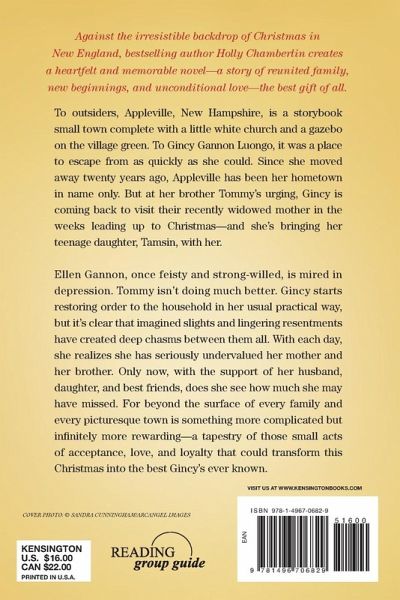 Against the irresistible backdrop of Christmas in New England, bestselling author Holly Chamberlin creates a heartfelt and memorable novel-a story of reunited family, new beginnings, and unconditional love-the best gift of all. To outsiders, Appleville, New Hampshire, is a storybook small town complete with a little white church and a gazebo on the village green. To Gincy Gannon Luongo, it was a place to escape from as quickly as she could. Since she moved away twenty years ago, Appleville has been her hometown in name only. But at her brother Tommy's urging, Gincy is coming back to visit their recently widowed mother in the weeks leading up to Christmas-and she's bringing her teenage daughter, Tamsin, with her. Ellen Gannon, once feisty and strong-willed, is mired in depression. Tommy isn't doing much better. Gincy starts restoring order to the household in her usual practical way, but it's clear that imagined slights and lingering resentments have created deep chasms between them all. With each day, she realizes she has seriously undervalued her mother and her brother. Only now, with the support of her husband, daughter, and best friends, does she see how much she may have missed. For beyond the surface of every family and every picturesque town is something more complicated but infinitely more rewarding-a tapestry of those small acts of acceptance, love, and loyalty that could transform this Christmas into the best Gincy's ever known.