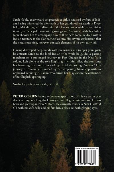 Sarah Noble, an awkward yet precocious girl, is wracked by fears of Indians having witnessed the aftermath of her grandmother's death in Deerfield, MA during an Indian raid. She has recurrent nightmares, visitations by an eerie pale horse with glowing eyes. Against all odds, her father John chooses her to accompany him to their new homesite deep within Indian territory in the Connecticut colony. His cryptic explanation that she needs seasoning, however, conceals elements of his own early life. Having developed deep bonds with the natives as a trapper years past, he entrusts Sarah to the local Indian tribe while he guides a passing merchant on a prolonged journey to Fort Orange in the New York colony. Left alone as the sole English girl within miles, she confronts her haunting fears and comes of age amid the strange "others." Her journey of discovery is guided by her deepening friendship with an orphaned Pequot girl, Takhi, who causes her to question the certainties of her English upbringing. Sarah's life path is irrevocably altered. Peter O'Brien before retirement spent most of his career in academic settings teaching Art History or in college administration. He was born and grew up in New Milford. He currently resides in New Hartford CT with his wife Sally and his familiar, a black cat with glowing eyes.