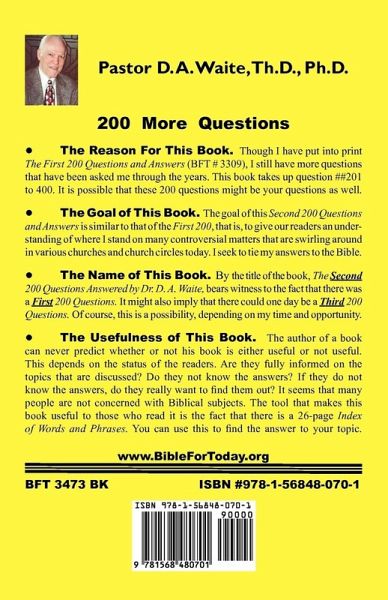This is Dr. D. A. Waite's second book that answers questions which he has received from all over the world concerning inquires about theology, the Bible, life, marriage and many other topic and situations. The book comes with an extensive index to assist individuals to find topics of interest. Please see his first book, and Lord willing, his third book will be out soon.