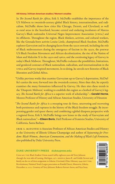 In The Second Battle for Africa, Erik S. McDuffie establishes the importance of the US Midwest to twentieth-century global Black history, internationalism, and radicalism. McDuffie shows how cities like Chicago, Detroit, and Cleveland, as well as rural areas in the heartland, became central and enduring incubators of Marcus Garvey's Black nationalist Universal Negro Improvement Association (UNIA) and its offshoots. Throughout the region, Black thinkers, activists, and cultural workers, like the Grenada-born activist Louise Little, championed Black freedom. McDuffie explores Garveyism and its changing facets from the 1920s onward, including the role of Black midwesterners during the emergence of fascism in the 1930s, the postwar US Black Freedom Movement and African decolonization, the rise of the Nation of Islam and Malcolm X in the 1950s and 1960s, and the continuing legacy of Garvey in today's Black Midwest. Throughout, McDuffie evaluates the possibilities, limitations, and gendered contours of Black nationalism, radicalism, and internationalism in the UNIA and Garvey-inspired movements. In so doing, he unveils new histories of Black liberation and Global Africa.