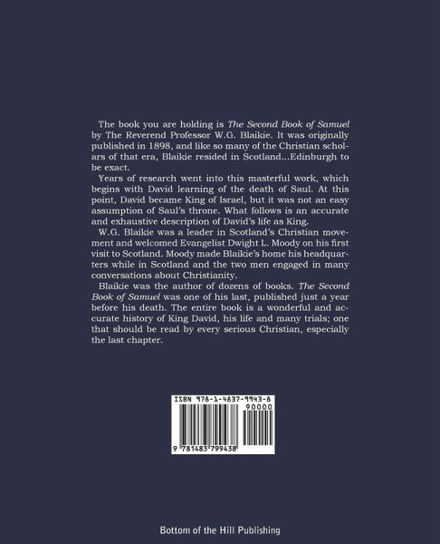 The events of the history of Israel as described in the books of Samuel, highlighting the life of David. During Saul's reign life darkened, but with David as King conditions were reversed and God's purpose regarding His people was greatly advanced. the death of Saul. At this point, David became King of Israel, but it was not an easy assumption of Saul's throne. What follows is an accurate and exhaustive description of David's life as King. W.G. Blaikie was a leader in Scotland's Christian movement and welcomed Evangelist Dwight L. Moody on his first visit to Scotland. Moody made Blaikie's home his headquarters while in Scotland and the two men engaged in many conversations about Christianity. Blaikie was the author of dozens of books. The Second Book of Samuel was one of his last, published just a year before his death. The entire book is a wonderful and accurate history of King David, his life and many trials; one that should be read by every serious Christian, especially the last chapter.