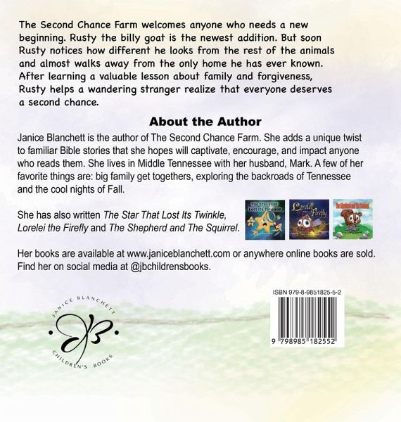 The Second Chance Farm welcomes anyone who needs a new beginning. Rusty the billy goat is the newest addition. But soon Rusty notices how different he looks from the rest of the animals and almost walks away from the only home he has ever known. ¿After learning a valuable lesson about family and forgiveness, Rusty helps a wandering stranger realize that everyone deserves a second chance.