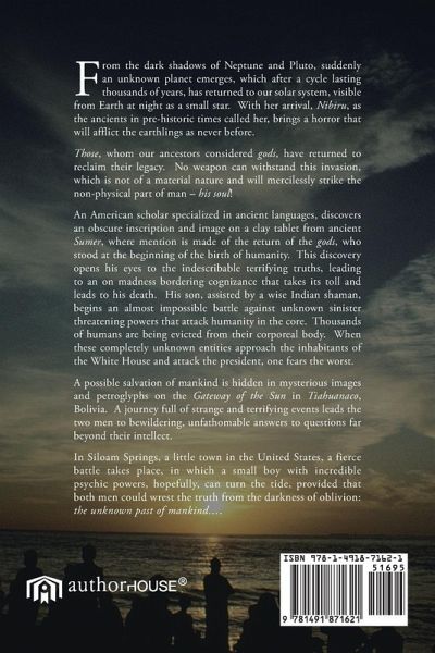 From the dark shadows of Neptune and Pluto, suddenly an unknown planet emerges, which after a cycle lasting thousands of years, has returned to our solar system, visible from Earth at night as a small star. With her arrival, Nibiru, as the ancients in pre-historic times called her, brings a horror that will afflict the earthlings as never before. Those, whom our ancestors considered gods, have returned to reclaim their legacy. No weapon can withstand this invasion, which is not of material nature and will mercilessly strike the non-physical part of man ¿ his soul! An American scholar specialized in ancient languages, discovers an obscure inscription and image on a clay tablet from ancient Sumer, where mention is made of the return of the gods, who stood at the beginning of the birth of humanity. This discovery opens his eyes to the indescribable terrifying truths, leading to an on madness bordering cognizance that takes its toll and leads to his death. His son, assisted by a wise Indian shaman, begins an almost impossible battle against unknown sinister threatening powers that attack humanity in the core. Thousands of humans are being evicted from their corporeal body. When these completely unknown entities approach the inhabitants of the White House and attack the president, one fears the worst. A possible salvation of mankind is hidden in mysterious images and petroglyphs on the Gateway of the Sun in Tiahuanaco, Bolivia. A journey full of strange and terrifying events leads the two men to bewildering, unfathomable answers to questions far beyond their intellect. In Siloam Springs, a little town in the United States, a fierce battle takes place, in which a small boy with incredible psychic powers, hopefully, can turn the tide, provided that both men could wrest the truth from the darkness of oblivion:the unknown past of mankind¿.