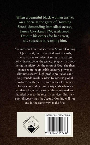 When a beautiful black woman arrives on a horse at the gates of Downing Street, demanding immediate access, James Cleveland, PM, is alarmed. Despite his orders for her arrest, she succeeds in reaching him. She informs him that she is the Second Coming of Jesus and, on this second visit to earth, she has come to judge. A series of apparent coincidences dents the general scepticism about her authenticity. As the scion of God, she then exercises an inexplicable coercive power to eliminate several high profile politicians and to persuade world leaders to address global problems with the required sense of urgency. Her success and her authority ends when she suddenly loses her powers. She is arrested and handed over to the security services. But they soon discover that the Second Coming will not end in the same way as the first.