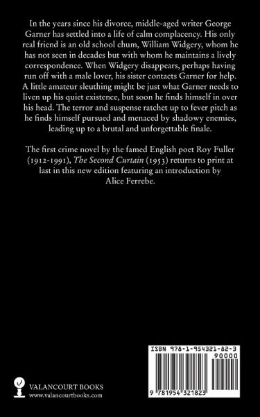 In the years since his divorce, middle-aged writer George Garner has settled into a life of calm complacency. His only real friend is an old school chum, William Widgery, whom he has not seen in decades but with whom he maintains a lively correspondence. When Widgery disappears, perhaps having run off with a male lover, his sister contacts Garner for help. A little amateur sleuthing might be just what Garner needs to liven up his quiet existence, but soon he finds himself in over his head. The terror and suspense ratchet up to fever pitch as he finds himself pursued and menaced by shadowy enemies, leading up to a brutal and unforgettable finale. The first crime novel by the famed English poet Roy Fuller (1912-1991), The Second Curtain (1953) returns to print at last in this new edition featuring an introduction by Alice Ferrebe. "An unqualified success ... a horribly sinister and completely convincing murder story." - Time and Tide "A most entertaining work ... a delightful novel." - New Statesman and Nation 'Beautifully written ... a first-class novel." - Nottingham Guardian