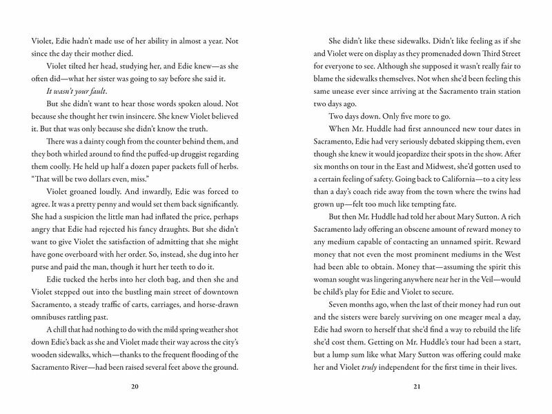 Cross into the spirit realm with this thrilling supernatural debut about sisterhood and female defiance, perfect for fans of Kerri Maniscalco— inspired by lives of real teenage twin mediums in the 19th century. "Deliciously chilling and edge-of-your-seat suspenseful.” —Nina LaCour, Printz Award–winning author of We Are Okay Sacramento, 1885 Edie and Violet Bond know the truth about death. The seventeen-year-old twins are powerful mediums, just like their mother—Violet can open the veil between life and death, and Edie can cross into the spirit world. But their abilities couldn’t save them when their mother died and their father threatened to commit them to a notorious asylum. Now runaways, Edie and Violet are part of a traveling Spiritualist show, a tight-knit group of young women who demonstrate their real talents under the guise of communing with spirits. Each night, actresses, poets, musicians, and orators all make contact with spirits who happen to have something to say. . . notions that young ladies could never openly express. But when Violet’s act goes terribly wrong one night, Edie learns that the dark spirit responsible for their mother’s death has crossed into the land of the living. As they investigate the identity of her mysterious final client, they realize that someone is hunting mediums…and they may be next.Only by trusting in one another can the twins uncover a killer who will stop at nothing to cheat death.