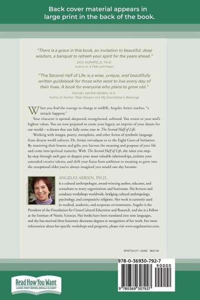 When you find the courage to change at midlife, Angeles Arrien teaches, ''a miracle happens.'' Your character is opened, deepened, strengthened, softened. You return to your souls highest values. You are now prepared to create your legacy: an imprint of your dream for our world - a dream that can fully come true in The Second Half of Life. Working with images, poetry, metaphors, and other forms of symbolic language from diverse world cultures, Dr. Arrien introduces us to the Eight Gates of Initiation. By mastering their lessons and gifts, you harvest the meaning and purpose of your life and come into spiritual maturity. With The Second Half of Life, she takes you step-by-step through each gate to deepen your most valuable relationships, reclaim your untended creative talents, and shift your focus from ambition to meaning to grow into the exceptional elder youve always imagined you would one day become.