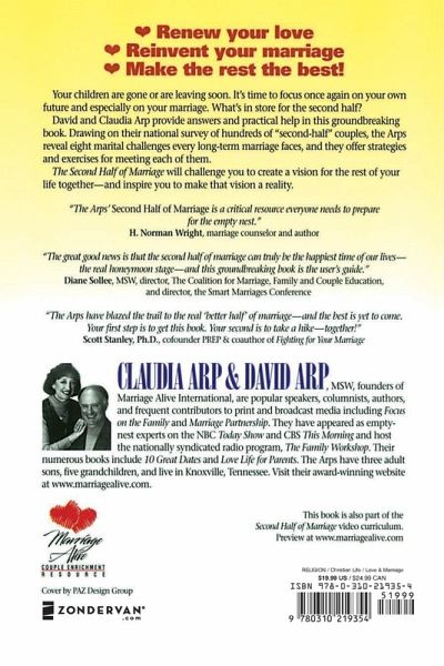 Your children are gone or leaving soon. It's time to focus once again on your own future and especially on your marriage. What's in store for the second half? David and Claudia Arp provide answers and practical help in this groundbreaking book. Drawing on their national survey of hundreds of "second-half" couples, the Arps reveal eight marital challenges every long-term marriage faces, and they offer strategies and exercises for meeting each of them. The Second Half of Marriage will challenge you to create a vision for the rest of your life together -- and inspire you to make that vision a reality.
