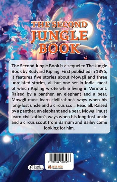 The Second Jungle Book is a sequel to The Jungle Book by Rudyard Kipling. First published in 1895, it features five stories about Mowgli and three unrelated stories, all but one set in India, most of which Kipling wrote while living in Vermont. Raised by a panther, an elephant and a bear, Mowgli must learn civilization's ways when his long-lost uncle and a circus sco... Read all. Raised by a panther, an elephant and a bear, Mowgli must learn civilization's ways when his long-lost uncle and a circus scout from Barnum and Bailey come looking for him.