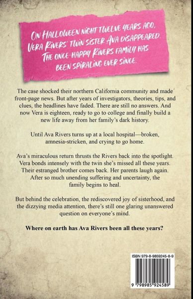 THREE STARRED REVIEWS "Remarkable."--VOYA "Genre-defying."--Booklist "Deeply compelling."--BCCB On Halloween night twelve years ago, Vera Rivers' twin sister Ava disappeared. The once-happy Rivers family has been spiraling ever since. The case shocked their Northern California community and made front-page news. But after years of investigators, theories, tips, and clues, the headlines have faded. There are still no answers. And now Vera is eighteen, ready to go to college and finally build a new life away from her family's dark history. Until Ava Rivers turns up at a local hospital-broken, amnesia-stricken, and crying to go home. Ava's miraculous return thrusts the Rivers back into the spotlight. Vera bonds intensely with the twin she's missed all these years. Their estranged brother comes back. Her parents laugh again. After so much unending suffering and uncertainty, the family begins to heal. But behind the celebration, the rediscovered joy of sisterhood, and the dizzying media attention, there's still one glaring, unanswered question on everyone's mind. Where on earth has Ava Rivers been all these years?