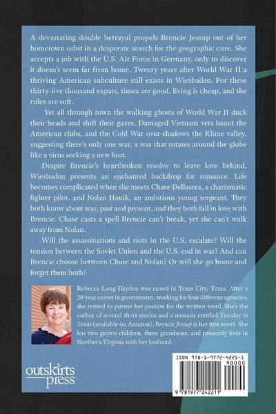It's 1968, and a devasting double betrayal propels Brencie Jessup out of her hometown in Texas, desperately seeking a geographic cure for her broken heart. She leaves her job at NASA and accepts a position with the U.S. Air Force in Germany, only to discover she isn't that far from home. Ten years after the official end of the World War II allied occupation, a thriving American sub-culture still exists in Wiesbaden. Thirty-five thousand expats enjoy a post-war raj. Times are good, living is cheap, and the rules are soft. Bearing secrets, Brencie arrives in Wiesbaden, and her surroundings impress her, from the cultivated beauty of the town to the imposing Amelia Earhart Hotel, home to single American women such as Brencie. Most of all, she's impressed and delighted by her new friend, free-spirited Lulu Greenholt. Because of her bad luck in love, Brencie has sworn off love, but Lulu says whether Brencie wants it or not, love is likely to find her, in a community where single men out-number single women by three to one. Lulu and Brencie drink too much champagne over breakfast at Lulu's apartment, and she educates Brencie on all the ways the U.S. Department of Defense makes living in abroad comfortable. The champagne flows, and Lulu asks Brencie if she's on the pill. Shocked, Brencie says single women in Friendswood can't get the pill, and some doctors require married women to get their husband's permission. In Wiesbaden, says Lulu, the American hospital dispenses birth control pills, no questions asked. Brencie reveals some details of her past, namely that her ex-fiancé looks disturbingly like her father, Anson Jessup. Anson deserted Brencie and her stepmother, Agnes-Rose Jessup, when Brencie was ten years old. It's clear to Lulu that Brencie's stepmother is a prime player in Brencie's life and history, but Brencie avoids talking about her. Military life is all Lulu has ever known. Her father, a career military man, was stationed in Germany, where Lulu graduated high school. When her family was reassigned to Omaha, Lulu stayed behind and got a job with the U.S. Air Force. Despite Brencie's resolve to leave love behind, she meets Chase Dellasera, a charismatic fighter pilot, whose duties take him away shortly after they meet. On her first day at work, she meets Nolan Hanik, an ambitious Staff Sergeant who plans to re-enroll in law school when his hitch is up. He's focused, determined, a star on the base football team, and immediately taken with Brencie. Her life becomes more complicated, just as Lulu predicted, and more challenging.