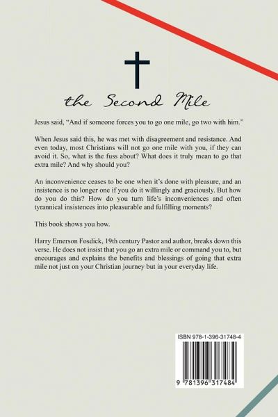 Jesus said, "And if someone forces you to go one mile, go two with him." When Jesus said this, he was met with disagreement and resistance. And even today, most Christians will not go one mile with you, if they can avoid it. So, what is the fuss about? What does it truly mean to go that extra mile? And why should you? An inconvenience ceases to be one when it's done with pleasure, and an insistence is no longer one if you do it willingly and graciously. But how do you do this? How do you turn life's inconveniences and often tyrannical insistences into pleasurable and fulfilling moments? This book shows you how. Harry Emerson Fosdick, 19th century Pastor and author, breaks down this verse. He does not insist that you go an extra mile or command you to, but encourages and explains the benefits and blessings of going that extra mile not just on your Christian journey but in your everyday life.