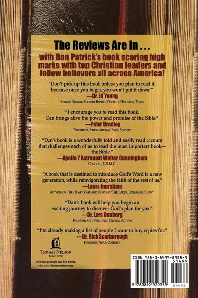 So what's your excuse for failing to read the MOST important book ever written, the Bible?Don't think you can understand the Bible?No time for Bible reading?No relevancy of the Bible to your life?Questions about the Bible's authenticity? Although most Americans own a Bible, polls show that few people have read the Bible or even parts of it. Perhaps what most Americans don't know is that the Bible has life-changing information about how toget right with Godknow why you are alive todayreceive God's guidance...dailyget through tough timeshave a successful marriage and family lifeknow what you really believe with confidencemanage your money and resourcescommunicate with Godbuild good relationshipsprepare for the future Dan Patrick's book is for those with little or no faith in God...for those who attend church but haven't read the Bible...and for serious Bible students. Read it, and then give a copy to a friend.