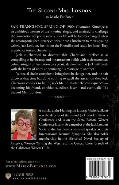A Scholar at the Huntington Library, Marlo Faulkner was the director of the annual Jack London Writers Conference and is on the Santa Barbara Writers Conference faculty. As a member of the Jack London Society, she has been a featured speaker at their International Biennial Symposia. She also holds membership in the Historical Novel Society of America, Women Writing the West, and the Central Coast branch of the California Writers Club.