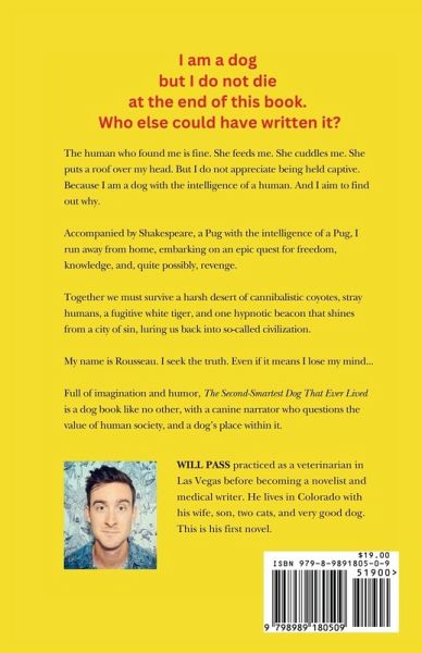 I am a dog but I do not die at the end of this book. Who else could have written it? The human who found me is fine. She feeds me. She cuddles me. She puts a roof over my head. But I do not appreciate being held captive. Because I have the intelligence of a human. And I aim to find out why. Accompanied by Shakespeare, a Pug with the intelligence of a Pug, I run away from home, embarking on an epic quest for freedom, understanding, and, quite possibly, revenge. Together we must survive a harsh desert of cannibalistic coyotes, stray humans, a fugitive white tiger, and one hypnotic beacon that shines from a city of sin, luring us back into so-called civilization. My name is Rousseau. I seek the truth. Even if it means I lose my mind. Full of imagination and humor, The Second-Smartest Dog That Ever Lived is a dog book like no other, with a canine narrator who questions the value of human society, and a dog's place within it.