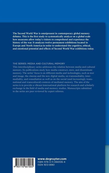 The Second World War is omnipresent in contemporary memory debates. As the war fades from living memory, this study is the first to systematically analyze how Second World War museums allow prototypical visitors to comprehend and experience the past. It analyzes twelve permanent exhibitions in Europe and North America - including the Bundeswehr Military History Museum in Dresden, the Museum of the Second World War in Gdansk, the House of European History in Brussels, the Imperial War Museums in London and Manchester, and the National WWII Museum in New Orleans - in order to show how museums reflect and shape cultural memory, as well as their cognitive, ethical, emotional, and aesthetic potential and effects. This includes a discussion of representations of events such as the Holocaust and air warfare. In relation to narrative, memory, and experience, the study develops the concept of experientiality (on a sliding scale between mimetic and structural forms), which provides a new textual-spatial method for reading exhibitions and understanding the experiences of historical individuals and collectives. It is supplemented by concepts like transnational memory, empathy, and encouraging critical thinking through difficult knowledge.