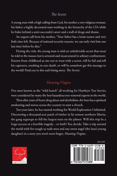 The Secret A young man with a high calling from God, his mother a very religious woman, his father a highly decorated man working in the hierarchy of the CIA while he hides behind a semi-successful career and a wall of drugs and shame. An urgent call from his mother, "Your father has a brain tumor and very little time left. Because of national security reasons, we can only visit him one last time before he dies." During the visit, the young man is told an unbelievable secret that must be told to the masses but is arrested and incarcerated in solitary confinement. Known from childhood as one not to trust with a secret, will he fail and tell his capturers, resulting in sure death, or will he somehow get this message to the world? Find out in this nail-biting story, The Secret. Hunting Virgins Five men known as the "wild bunch" all working for Hawkeye Tree Service were considered by many the best hazardous tree-removal experts in the world. Then after years of heavy drug abuse and alcoholism, the boss has a spiritual awakening and moves across the country to start a church. Ten years later, he has started working for World Exploration Unlimited. Discovering a thousand-acre patch of timber in far remote northern Siberia, the gang regroups to fell the largest trees on the planet. Will this trip be a huge success or a horrible tragedy...or both? You decide. Take a trip around the world with five tough-as-nails men and one sweet angel (the boss's young daughter) in a story you won't soon forget, Hunting Virgins.