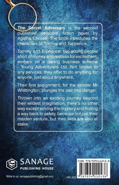 Agatha Christie's first Tommy & Tuppence book is a thrill-packed novel of international intrigue, murder and suspense. Tommy and Tuppence who feature in three other Christie novels and one collection of short stories. Childhood friends Tommy Beresford and Prudence "Tuppence" Cowley meet and agree to start their own business as The Young Adventurers. They are hired for a job that leads them both to many dangerous situations, meeting allies as well, including an American millionaire in search of his cousin.
