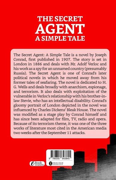 The Secret Agent: A Simple Tale is a novel by Joseph Conrad, first published in 1907.[1] The story is set in London in 1886 and deals with Mr. Adolf Verloc and his work as a spy for an unnamed country (presumably Russia). The Secret Agent is one of Conrad's later political novels in which he moved away from his former tales of seafaring. The novel is dedicated to H. G. Wells and deals broadly with anarchism, espionage, and terrorism. It also deals with exploitation of the vulnerable in Verloc's relationship with his brother-in-law Stevie, who has an intellectual disability. Conrad's gloomy portrait of London depicted in the novel was influenced by Charles Dickens' Bleak House. The novel was modified as a stage play by Conrad himself and has since been adapted for film, TV, radio and opera. Because of its terrorism theme, it was one of the three works of literature most cited in the American media two weeks after the September 11 attacks.