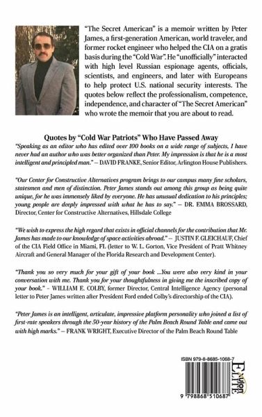 "The Secret American" is a memoir written by Peter James, a first-generation American, world traveler, and former rocket engineer who helped the CIA on a gratis basis during the "Cold War". He "unofficially" interacted with high level Russian espionage agents, officials, scientists, and engineers, and later with Europeans to help protect U.S. national security interests. The quotes below reflect the professionalism, competence, independence, and character of "The Secret American" who wrote the memoir that you are about to read. Quotes by "Cold War Patriots" Who Have Passed Away "Speaking as an…mehr