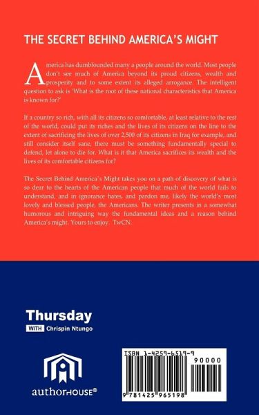 THE SECRET BEHIND AMERICA'S MIGHT America has dumbfounded many a people around the world. Most people don't see much of America beyond its proud citizens, wealth and prosperity and to some extent its alleged arrogance. The intelligent question to ask is 'What is the root of these national characteristics that America is known for?' If a country so rich, with all its citizens so comfortable, at least relative to the rest of the world, could put its riches and the lives of its citizens on the line to the extent of sacrificing the lives of over 2,500 of its citizens in Iraq for example, and still consider itself sane, there must be something fundamentally special to defend, let alone to die for. What is it that America sacrifices its wealth and the lives of its comfortable citizens for? The Secret Behind America's Might takes you on a path of discovery of what is so dear to the hearts of the American people that much of the world fails to understand, and in ignorance hates, and pardon me, likely the world's most lovely and blessed people, the Americans. The writer presents in a somewhat humorous and intriguing way the fundamental ideas and a reason behind America's might. Yours to enjoy. TwCN.