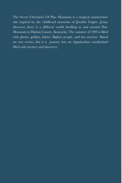 The Secret Chronicles Of Pine Mountain is a magical summertime tale inspired by the childhood memories of Jennifer Fugate. Jenny discovers there is a different world dwelling in and around Pine Mountain in Harlan County, Kentucky. The summer of 1993 is filled with ghosts, goblins, fairies, Bigfoot people, and lost treasure. Based on true events, this is a journey into an Appalachian wonderland filled with mystery and discovery.