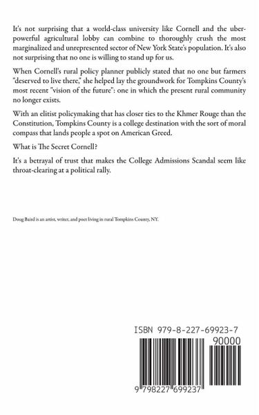It's not surprising that a world-class university like Cornell and the uber-powerful agricultural lobby can combine to thoroughly crush the most marginalized and unrepresented sector of New York State's population. It's also not surprising that no one is willing to stand up for us. When Cornell's rural policy planner publicly stated that no one but farmers "deserved to live there," she helped lay the groundwork for Tompkins County's most recent "vision of the future": one in which the present rural community no longer exists. With an elitist policymaking that has closer ties to the Khmer Rouge than the Constitution, Tompkins County is a college destination with the sort of moral compass that lands people a spot on American Greed. What is The Secret Cornell? It's a betrayal of trust that makes the College Admissions Scandal seem like throat-clearing at a political rally. ¿