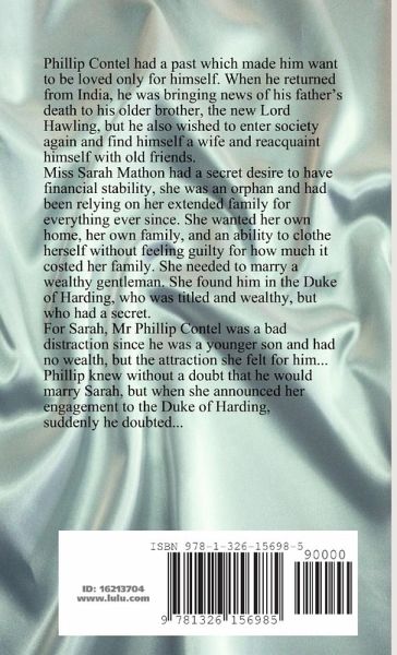 Phillip Contel had a past which made him want to be loved for himself. When he returned from India, he was bringing news of his father's death to his older brother, the new Lord Hawling, but he also wished to enter society again and find himself a wife and reacquaint himself with old friends. Miss Sarah Mathon had a desire to have financial stability, she was an orphan and had been relying on her extended family for everything ever since. She wanted her own home, her own family, and an ability to clothe herself without feeling guilty for how much it costed her extended family. She needed to marry a wealthy gentleman. She found him in the Duke of Harding, who was titled and wealthy, but who owned a secret. For Sarah, Mr Phillip Contel was a bad distraction since he was a younger son and had no wealth, but she could not ignore the attraction she felt for him. Phillip knew without a doubt that he would marry Sarah, but when she announced her engagement to the Duke of Harding, suddenly he doubted...