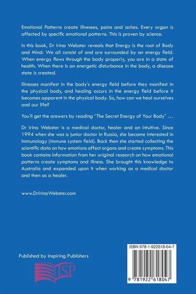 Emotional Patterns create illnesses, pains and aches. Every organ is affected by specific emotional patterns. This is proven by science. In this book Dr Irina Webster reveals that Energy is the root of Body and Mind. We all consist of and are surrounded by an energy field. When energy flows through the body properly, you are in a state of health. When there is an energetic disturbance in the body, a disease state is created. Illnesses manifest in the body's energy field before they manifest in the physical body. And healing occurs in the energy field before it becomes apparent in the physical body. So, how can we heal ourselves and our life? You'll get the answers reading "The Secret Energy of Your Body" ... Dr Irina Webster is a medical doctor, healer and an intuitive. Since 1994 when she was a junior doctor in Russia, she became interested in Immunology (immune system field). Back then she started collecting the scientific data how emotions affect organs and create symptoms. This book shows information from her original research about how emotional patterns create symptoms and illness. She brought this knowledge to Australia and elaborated it when working as a doctor and then as a healer.