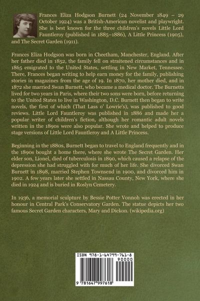 Frances Eliza Hodgson Burnett (24 November 1849 – 29 October 1924) was a British-American novelist and playwright. She is best known for the three children's novels Little Lord Fauntleroy (published in 1885–1886), A Little Princess (1905), and The Secret Garden (1911). Frances Eliza Hodgson was born in Cheetham, Manchester, England. After her father died in 1852, the family fell on straitened circumstances and in 1865 emigrated to the United States, settling in New Market, Tennessee. There, Frances began writing to help earn money for the family, publishing stories in magazines from the age of 19. In 1870, her mother died, and in 1872 she married Swan Burnett, who became a medical doctor. The Burnetts lived for two years in Paris, where their two sons were born, before returning to the United States to live in Washington, D.C. Burnett then began to write novels, the first of which (That Lass o' Lowrie's), was published to good reviews. Little Lord Fauntleroy was published in 1886 and made her a popular writer of children's fiction, although her romantic adult novels written in the 1890s were also popular. She wrote and helped to produce stage versions of Little Lord Fauntleroy and A Little Princess. Beginning in the 1880s, Burnett began to travel to England frequently and in the 1890s bought a home there, where she wrote The Secret Garden. Her elder son, Lionel, died of tuberculosis in 1890, which caused a relapse of the depression she had struggled with for much of her life. She divorced Swan Burnett in 1898, married Stephen Townsend in 1900, and divorced him in 1902. A few years later she settled in Nassau County, New York, where she died in 1924 and is buried in Roslyn Cemetery. In 1936, a memorial sculpture by Bessie Potter Vonnoh was erected in her honour in Central Park's Conservatory Garden. The statue depicts her two famous Secret Garden characters, Mary and Dickon. (wikipedia.org)