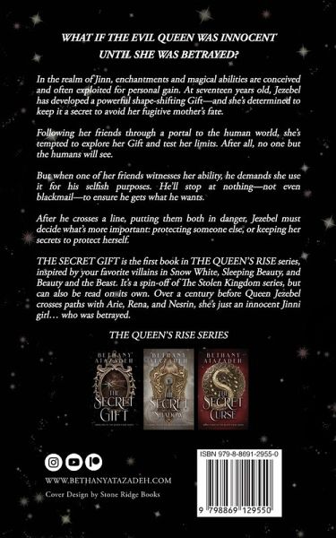 What if the evil queen in your favorite fairy tale wasn't born wicked... she was made that way? Jezebel is a seventeen-year-old girl with a secret: a dangerous shapeshifting ability that breaks every law in the realm of Jinn. If it's discovered, her gift will be severed... and severance always ends in death. When a hidden portal leads her into the human world, Jezebel seizes the chance to test her new power. But someone sees. Someone she trusted. At first, his betrayal comes in whispers. Then come the threats, the blackmail, and the slow erosion of everything Jezebel believed. Piece by piece, she begins to lose the girl she used to be. To survive, she'll have to become the very thing they always feared... In a gripping tale of betrayal and self-discovery, The Queen's Rise series brings a captivating twist to classic fairy tales like Snow White, Sleeping Beauty, and Beauty and the Beast... showing how even the darkest queens aren't the villains in their own story. If you love fairytale retellings like The Lunar Chronicles and supernatural abilities like the Graceling series, then you'll love the Queen's Rise series! 2nd edition, previously published September 2021. Reading order for THE QUEEN'S RISE series: Book 1: The Secret Gift Book 2: The Secret Shadow Book 3: The Secret Curse Reading order for THE STOLEN KINGDOM companion series: Book 1: The Stolen Kingdom Book 2: The Jinni Key Book 3: The Cursed Hunter Book 4: The Enchanted Crown