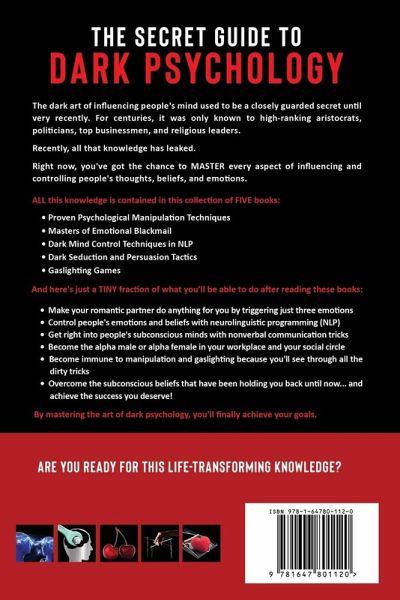 This Knowledge Is More Powerful Than You Think. Stay Away Unless You Really Want To Master The Art Of Persuasion And Mind Control! You probably know those people. Those who get anything they want. The woman who can ensnare a rich boyfriend with a smile and a few words. The short, bald guy who's always surrounded by hot women. The person who gets promoted every year. The person who's less educated than you but earns twice as much. So... why can't you be like them and get what you want, too? You've probably read a few self-help books but the effects were rather disappointing. Yes, you've learned to smile and remember people's names, and maybe you've even tried a few positive affirmations. But you didn't get any closer to your goal. To become a master of seduction, persuasion, and mind control, you need knowledge of a different kind - something you won't find in mainstream psychology books. The dark art of influencing people's mind used to be a closely guarded secret until very recently. For centuries, it was only known to high-ranking aristocrats, politicians, top businessmen, and religious leaders. Recently, all that knowledge has leaked. Right now, you've got the chance to MASTER every aspect of influencing and controlling people's thoughts, beliefs, and emotions. ¿ALL this knowledge is contained in this collection of FIVE books:Unholy Psychological Manipulation Techniques Masters of Emotional Blackmail Dark Mind Control Techniques in NLP Dark Seduction and Persuasion Tactics Gaslighting Games And here's just a TINY fraction of what you'll be able to do after reading these books:Trigger irresistible sexual desire in any target of your choosing Make your romantic partner do anything for you by triggering just three emotions Control people's emotions and beliefs with neurolinguistic programming (NLP) Get right into people's subconscious minds with nonverbal communication tricks Identify and exploit other people's weaknesses to get what you want Become the alpha male or alpha female in your workplace and your social circle Become immune to manipulation and gaslighting because you'll see through all the dirty tricks Overcome the subconscious beliefs that have been holding you back until now... and achieve the success you deserve! By mastering the art of dark psychology, you'll finally achieve your goals - no matter if it's seducing someone completely out of your league, winning a power struggle with your in-laws, climbing to the top of the corporate ladder, or becoming a powerful public speaker. And you'll do it even if you think of yourself as a shy, unimpressive, anxious person right now. Simply follow the step-by-step psychological strategies you'll find in the book and you'll transform into a powerful, confident, charismatic alpha personality. Are you ready for this life-transforming knowledge?Scroll up, click on "Buy Now with 1-Click" and Dive Into The Dark Secrets Of The Human Mind!