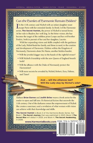 Can the Hamlet of Harmonie Remain Hidden? It's the 11th century and Nichol with an infant daughter must escape Paris with her extended family. In Book 2 of the Harmonie series, The Secret Hamlet, the power of Nichol is turned loose. At her side is Shadow, her wolf dog. In the bitter winter, she has become the target of the ruthless priest Loupe and her evil brother Fredric, both in pursuit of her and her daughter, Lucette. With her expanding vision and skills coupled with the guidance of the Lady, Nichol leads her family, and those in need, to the creation and development of Harmonie. Hidden within the Kingdom of Normandy, Harmonie abuts No Name, another hidden hamlet. Will the jeweled dagger stay in the hands of the rightful owner? Will Nichol's friendship with the new Queen of England benefit both? Will the alliance with the Duke of Normandy protect the Harmonites? Will more secrets be revealed by Nichol, Robert, Ezra, Helene, and Timo? And ... will the alliances last? Will the Lady stay by Nichol's side? Authors Brian Barnes and Judith Briles weave a book series for the reader to open and fall into. It's historical fiction that unravels the 11th century. Out of the darkness comes the empowerment of Nichol ... a sanctuary, and the revelation of what women with vision can achieve.