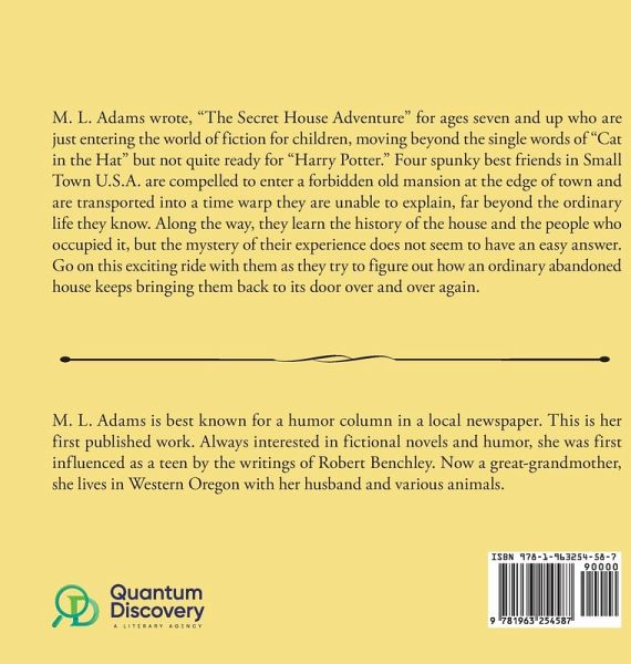 M. L. Adams wrote, "The Secret House Adventure" for ages seven and up who are just entering the world of fiction for children, moving beyond the single words of "Cat in the Hat" but not quite ready for "Harry Potter." Four spunky best friends in Small Town U.S.A. are compelled to enter a forbidden old mansion at the edge of town and are transported into a time warp they are unable to explain, far beyond the ordinary life they know. Along the way, they learn the history of the house and the people who occupied it, but the mystery of their experience does not seem to have an easy answer. Go on this exciting ride with them as they try to figure out how an ordinary abandoned house keeps bringing them back to its door over and over again. M. L. Adams is best known for a humor column in a local newspaper. This is her first published work. Always interested in fictional novels and humor, she was first influenced as a teen by the writings of Robert Benchley. Now a great-grandmother, she lives in Western Oregon with her husband and various animals.
