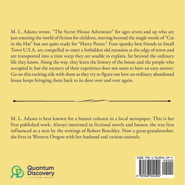 M. L. Adams wrote, "The Secret House Adventure" for ages seven and up who are just entering the world of fiction for children, moving beyond the single words of "Cat in the Hat" but not quite ready for "Harry Potter." Four spunky best friends in Small Town U.S.A. are compelled to enter a forbidden old mansion at the edge of town and are transported into a time warp they are unable to explain, far beyond the ordinary life they know. Along the way, they learn the history of the house and the people who occupied it, but the mystery of their experience does not seem to have an easy answer. Go on this exciting ride with them as they try to figure out how an ordinary abandoned house keeps bringing them back to its door over and over again. M. L. Adams is best known for a humor column in a local newspaper. This is her first published work. Always interested in fictional novels and humor, she was first influenced as a teen by the writings of Robert Benchley. Now a great-grandmother, she lives in Western Oregon with her husband and various animals.