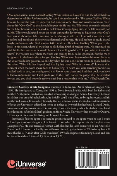 Once upon a time, a man named Godfrey White took it on himself to read the whole bible to determine its validity. Unfortunately, he could not understand it. This upset Godfrey White because he saw the positive impact it had done on other lives and wanted to know more about this "One God" so that it could impact his life too. Mr. White was extremely irritated by the bible because when he read it, he felt like it was judging him, so he felt unworthy of it. Mr. White would spend hours on hours during the day trying to figure out what God's love was all about but felt it was too overwhelming to take in. He would sometimes read it before bed but found the stories as fictional and boring. He did his best to study it and maybe understand who God was but failed to do so. Therefore, Godfrey White placed the book in his closet, where all the other books he had finished reading were. He continued on with his life but everyday he would hear a voice calling to him, "Do you wish to know the truth?" He was not sure where the voice was coming from, so he ignored it. But the more he ignored it, the louder the voice got. Godfrey White soon began to lose his mind because the voice would not go away, so one day when he was alone in his room he spoke back to the voice, "Who is it that is speaking? Am I going crazy? What is the truth?" It was at that moment when the voice spoke back to him saying, "I heard you were searching for me, so I called back to you, but you ignored me. Go to your closet and find that book you have failed to understand, and I will guide you to the truth. Today the gospel shall be revealed to you, and you shall not only receive truth but a relationship with me." #TheSecretIsOut