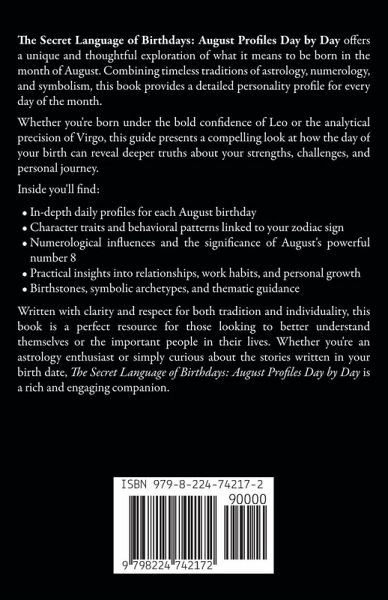 The Secret Language of Birthdays: August Profiles Day by Day offers a unique and thoughtful exploration of what it means to be born in the month of August. Combining timeless traditions of astrology, numerology, and symbolism, this book provides a detailed personality profile for every day of the month. Whether you're born under the bold confidence of Leo or the analytical precision of Virgo, this guide presents a compelling look at how the day of your birth can reveal deeper truths about your strengths, challenges, and personal journey. Inside you'll find:In-depth daily profiles for each August birthday Character traits and behavioral patterns linked to your zodiac sign Numerological influences and the significance of August's powerful number 8 Practical insights into relationships, work habits, and personal growth Birthstones, symbolic archetypes, and thematic guidance Written with clarity and respect for both tradition and individuality, this book is a perfect resource for those looking to better understand themselves or the important people in their lives. Whether you're an astrology enthusiast or simply curious about the stories written in your birth date, The Secret Language of Birthdays: August Profiles Day by Day is a rich and engaging companion.