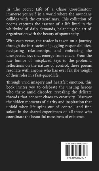 In "The Secret Life of a Chaos Coordinator," immerse yourself in a world where the mundane collides with the extraordinary. This collection of poems captures the essence of a life lived in the whirlwind of daily demands, balancing the art of organization with the beauty of spontaneity. With each verse, the reader is taken on a journey through the intricacies of juggling responsibilities, navigating relationships, and embracing the unexpected joys that emerge from chaos. From the raw humor of misplaced keys to the profound reflections on the nature of control, these poems resonate with anyone who has ever felt the weight of their roles in a fast-paced life. Through vivid imagery and heartfelt emotion, this book invites you to celebrate the unsung heroes who thrive amid disorder, revealing the delicate threads that connect chaos to creativity. Discover the hidden moments of clarity and inspiration that unfold when life spins out of control, and find solace in the shared experiences of all those who coordinate the beautiful messiness of existence.
