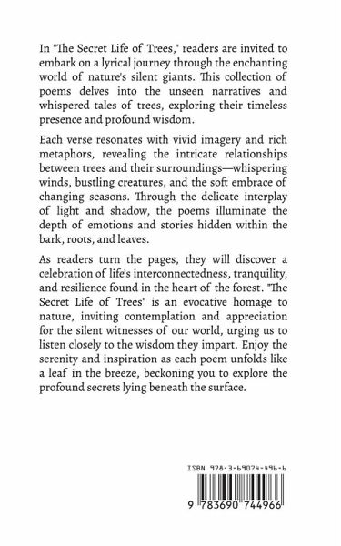 In "The Secret Life of Trees," readers are invited to embark on a lyrical journey through the enchanting world of nature's silent giants. This collection of poems delves into the unseen narratives and whispered tales of trees, exploring their timeless presence and profound wisdom. Each verse resonates with vivid imagery and rich metaphors, revealing the intricate relationships between trees and their surroundings-whispering winds, bustling creatures, and the soft embrace of changing seasons. Through the delicate interplay of light and shadow, the poems illuminate the depth of emotions and stories hidden within the bark, roots, and leaves. As readers turn the pages, they will discover a celebration of life's interconnectedness, tranquility, and resilience found in the heart of the forest. "The Secret Life of Trees" is an evocative homage to nature, inviting contemplation and appreciation for the silent witnesses of our world, urging us to listen closely to the wisdom they impart. Enjoy the serenity and inspiration as each poem unfolds like a leaf in the breeze, beckoning you to explore the profound secrets lying beneath the surface.