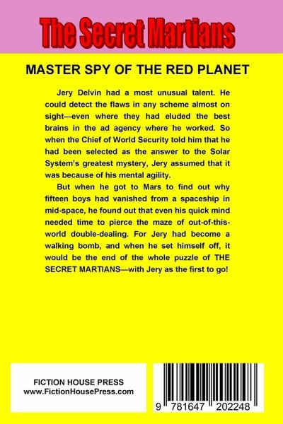MASTER SPY OF THE RED PLANET -- Jery Delvin had a most unusual talent. He could detect the flaws in any scheme almost on sight-even where they had eluded the best brains in the ad agency where he worked. So when the Chief of World Security told him that he had been selected as the answer to the Solar System's greatest mystery, Jery assumed that it was because of his mental agility. But when he got to Mars to find out why fifteen boys had vanished from a spaceship in mid-space, he found out that even his quick mind needed time to pierce the maze of out-of-this-world double-dealing. For Jery had become a walking bomb, and when he set himself off, it would be the end of the whole puzzle of THE SECRET MARTIANS-with Jery as the first to go!