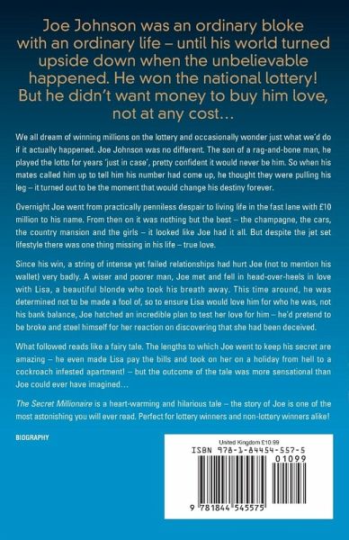We all dream of winning millions on the lottery and occasionally wonder just what we'd do if it actually happened. Joe Johnson was no different. The son of a rag and-bone man, he played the lotto for years 'just in case', and always had a hunch that he might get lucky. But when he first found out that his numbers had come up, he thought someone was pulling his leg - it turned out to be the moment that would change his destiny forever.Overnight, Joe went from practically penniless despair to living life in the fast lane with GBP 10 million to his name. From then on it was nothing but the best - the champagne, the cars, the country mansion and the girls - it looked like Joe had it all. But despite the jetset lifestyle there was one thing missing in his life - true love.Since his win, a string of intense yet failed relationships had hurt Joe (not to mention his wallet) very badly. A wiser (yet poorer!) man, Joe met and fell in head-over heels in love with Lisa, a beautiful blonde who took his breath away. This time around, he was determined not to be made a fool of, so to ensure Lisa would love him for who he was, not his bank balance, Joe hatched an incredible plan to test her love for him - he'd pretend to be broke and steel himself for her reaction on discovering that she had been deceived. What followed reads like a fairytale.The lengths to which Joe went to keep his secret are amazing - he even made Lisa pay the bills and took her on a holiday from hell to a cockroach-infested apartment! But the outcome of the tale was more sensational than Joe could ever have imagined..."A Whole Lotto Love" is a heart-warming and hilarious tale, and the story of Joe is one of the most astonishing you will ever read. It is perfect for lottery winners and non-lottery winners alike!